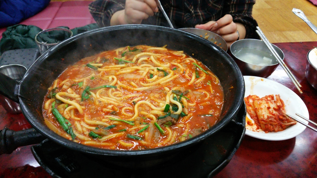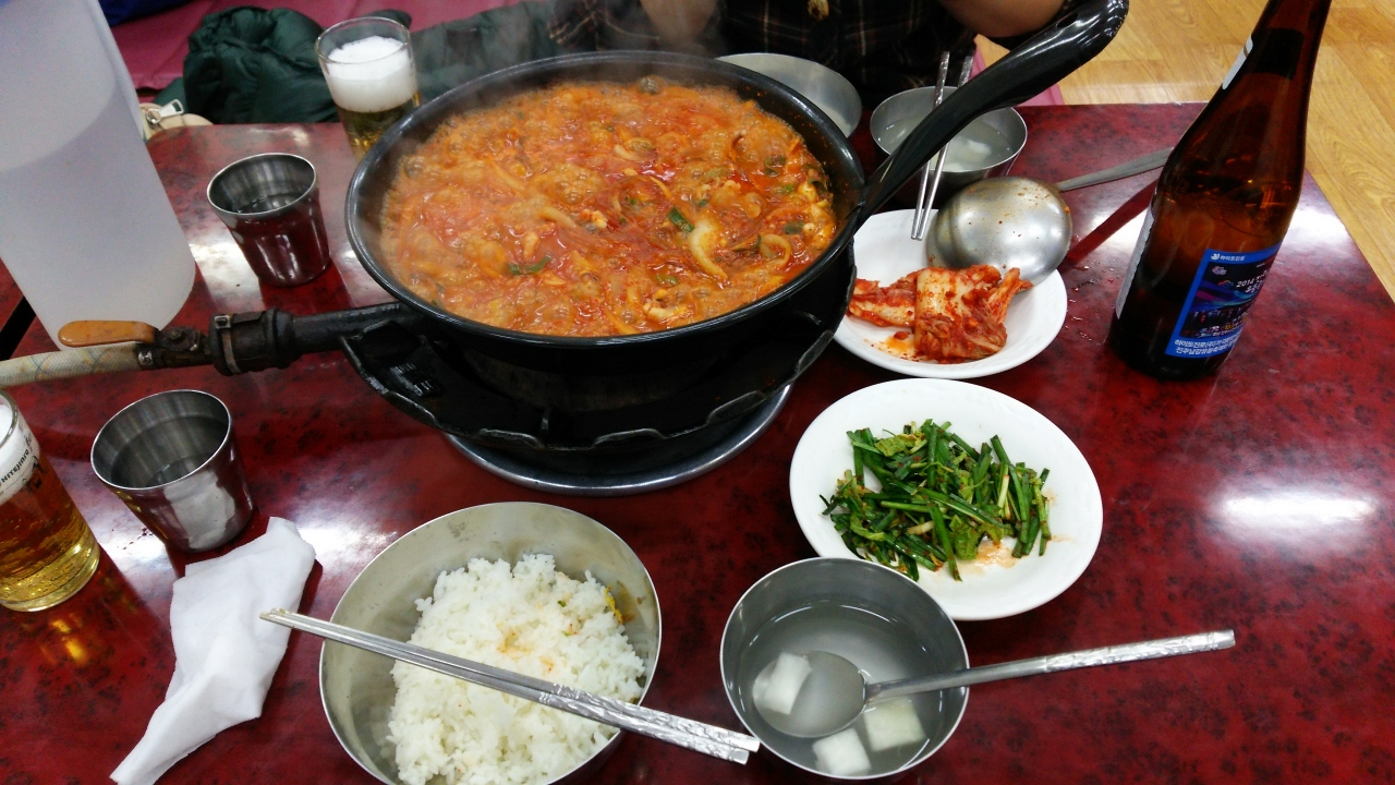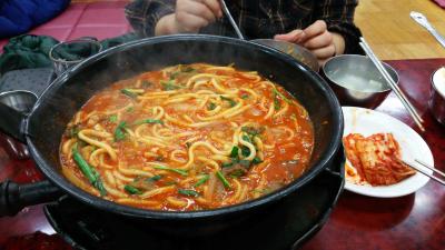 19時ころ伺った時には外見で既に満席。2階席に通されました。日本語通じず+メニューもなし。雰囲気でタコ海老鍋をオーダー。口コミなどには辛くないと書いてありますが、子供には無理かなレベルで辛いと思います。美味しいギリギリといったとこ。ビールに合います!〆はうどんをオーダーしました。こしはありませんが、インスタントラーメンだとどうも合わない気がして・・・値段は妥当です。おなかいっぱいの量でした。