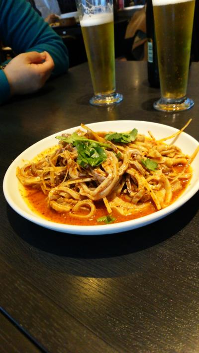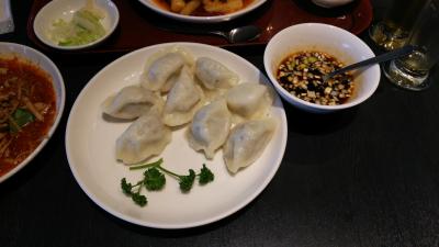 ランチメニューから海老炒め、別にモツ冷菜、水餃子をオーダー。生ビールで乾杯です。おかずはおつまみとしてはちょうどいい味付け。値段も空港にしては高くないので、好評価でした。刀削麺はあまり食べないので、ここでも頼んでません。