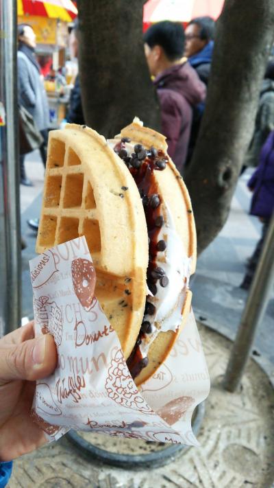 BIFF広場ってホットックとか有名ですね。で、ホットック食べようかなって思ってたら、並んでる!そりゃ学校も終わってる夕方のこの時間、学生たち並ぶよね。もっと来ればよかった。並ぶの苦手なので、というか、すぐ横で売っていたワッフルがおいしそうだったので購入。かなり大きな焼き立てワッフルが想像以上においしくて、出逢いの偶然を感じてしまいます。店の名前は思い出せず。今度の釜山でも行こうと思います。