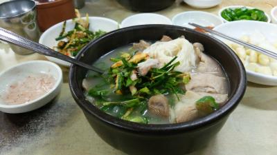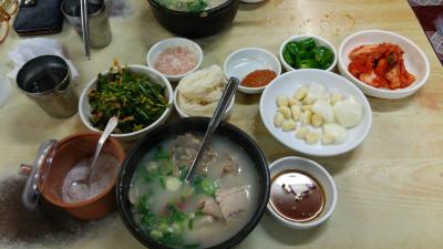 ノーマルなテジクッパですが、肉は予想よりたっぷり入っていたし、付け合せも朝からにんにく臭くなって困っちゃうくらい出てくるし、うれしいくらい。お酒飲みたいな。でも控えました。だってもう店内に飲んでるおじさんがいて、ちょっと引いたから。