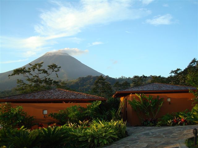 ロッジ形式のホテルで、部屋からはアレナル火山が見えます。