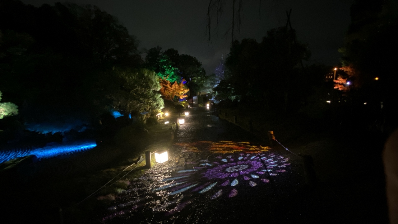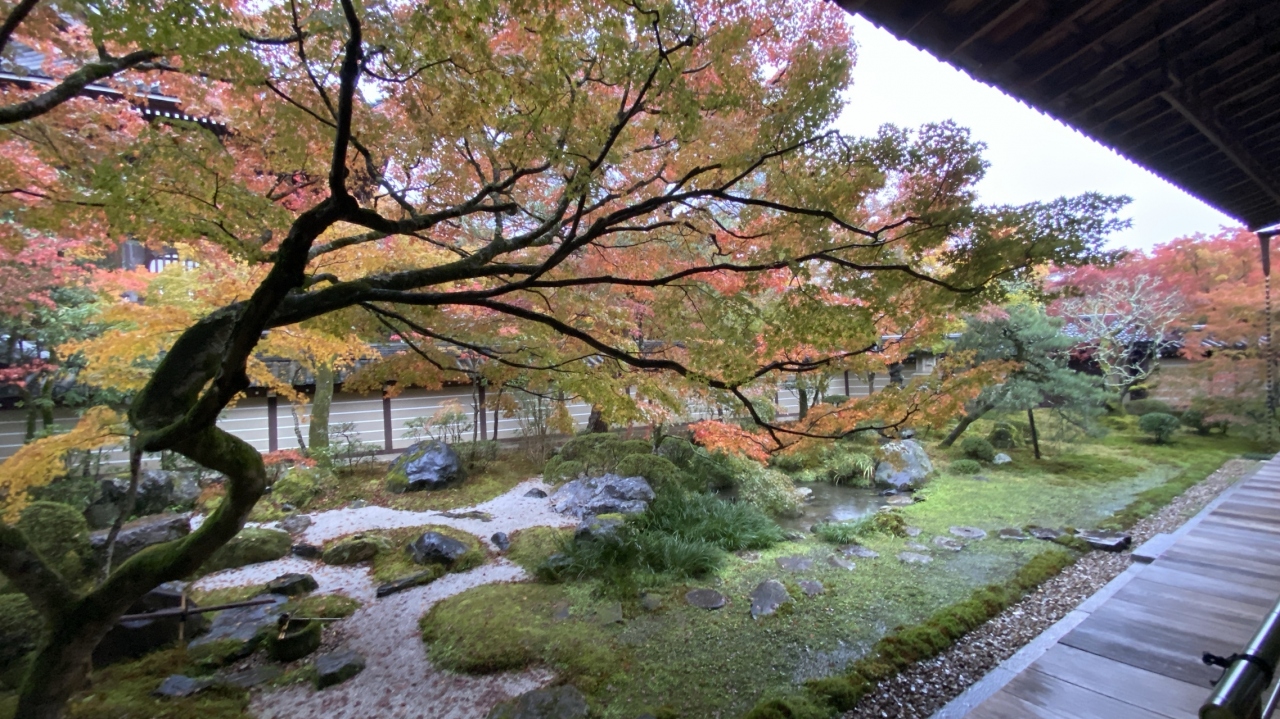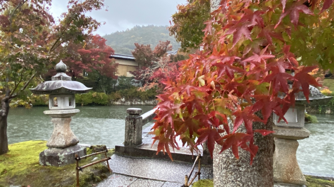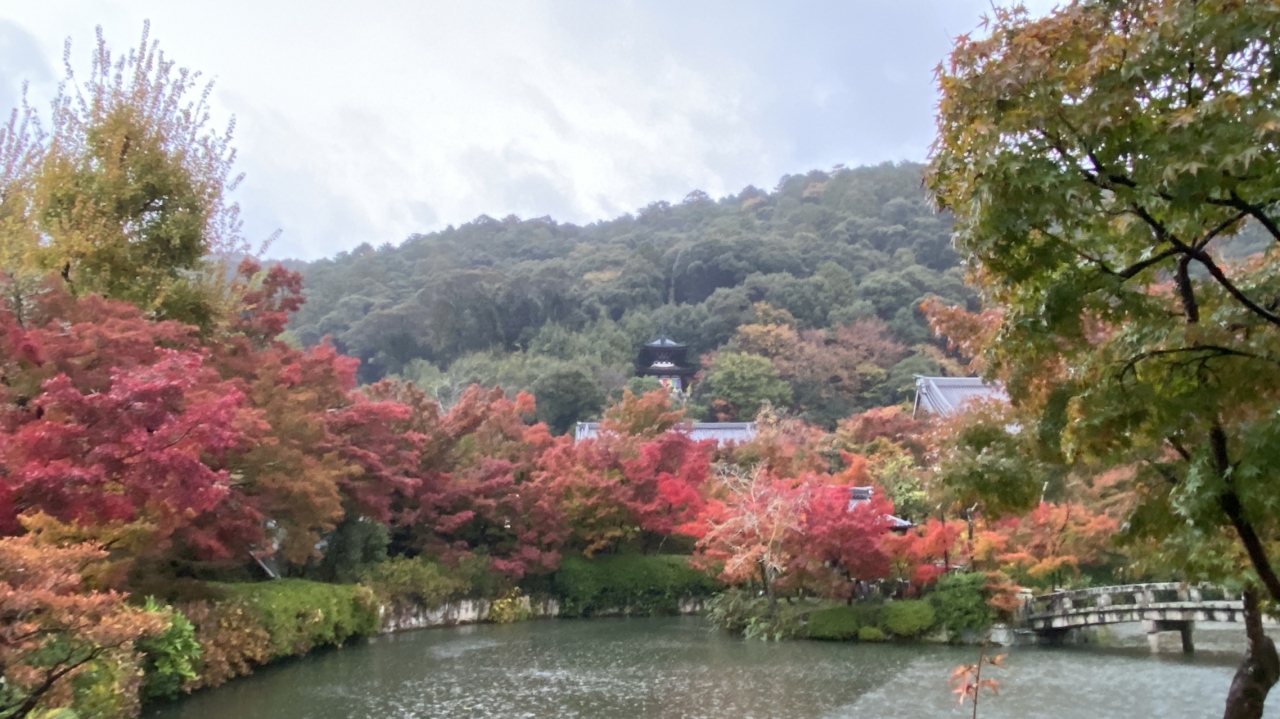 紅葉が真っ赤で、色んな背景があり見応えあります。夜のライトアップも素敵です。靴を脱いでお庭の紅葉を見ながら、お堂を渡り歩きます。お堂から出て池へ進むと、さらに紅葉が広がっていて、水面に映る紅葉は幻想的。