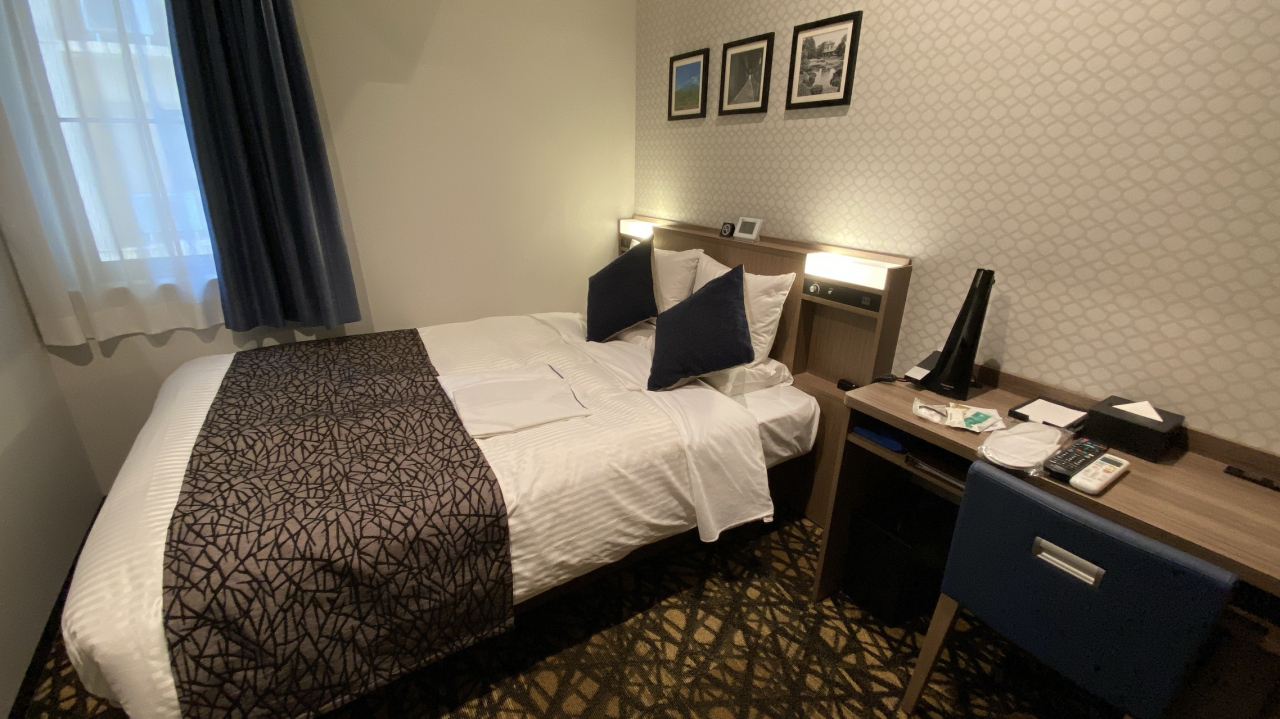 青森駅から徒歩5分くらい。1階にドトールや大戸屋があり、さくら野百貨店やワ・ラッセ、アスパム青森も徒歩圏内、飲食店も多く立地が良いですね。浴室とトイレが別という客室。宿泊した時はダブルでこじんまりとした部屋でしたが、とてもきれいで快適でした。フロントが3階なので、外出時はフロントを通らず1階から出られます。