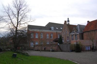広場をさらに奥へと進むとベギン会修道院方面。カフェが並ぶ広場中央とは対...