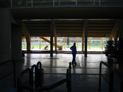 外から覗いたスタジアムの様子。暑いので水を撒いてました。