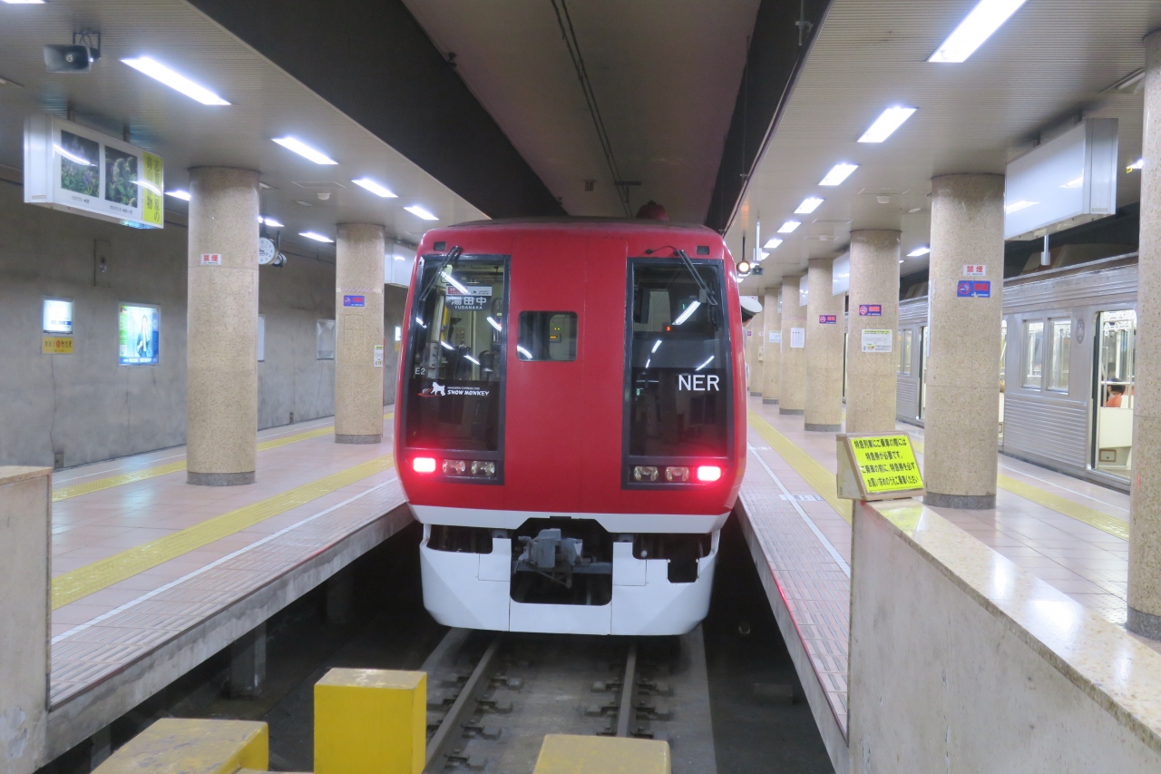 長野電鉄では,いろいろな鉄道会社で活躍した車両がやって来て使われていますが,この車両はJRの成田エクスプレスで活躍していた車両です.