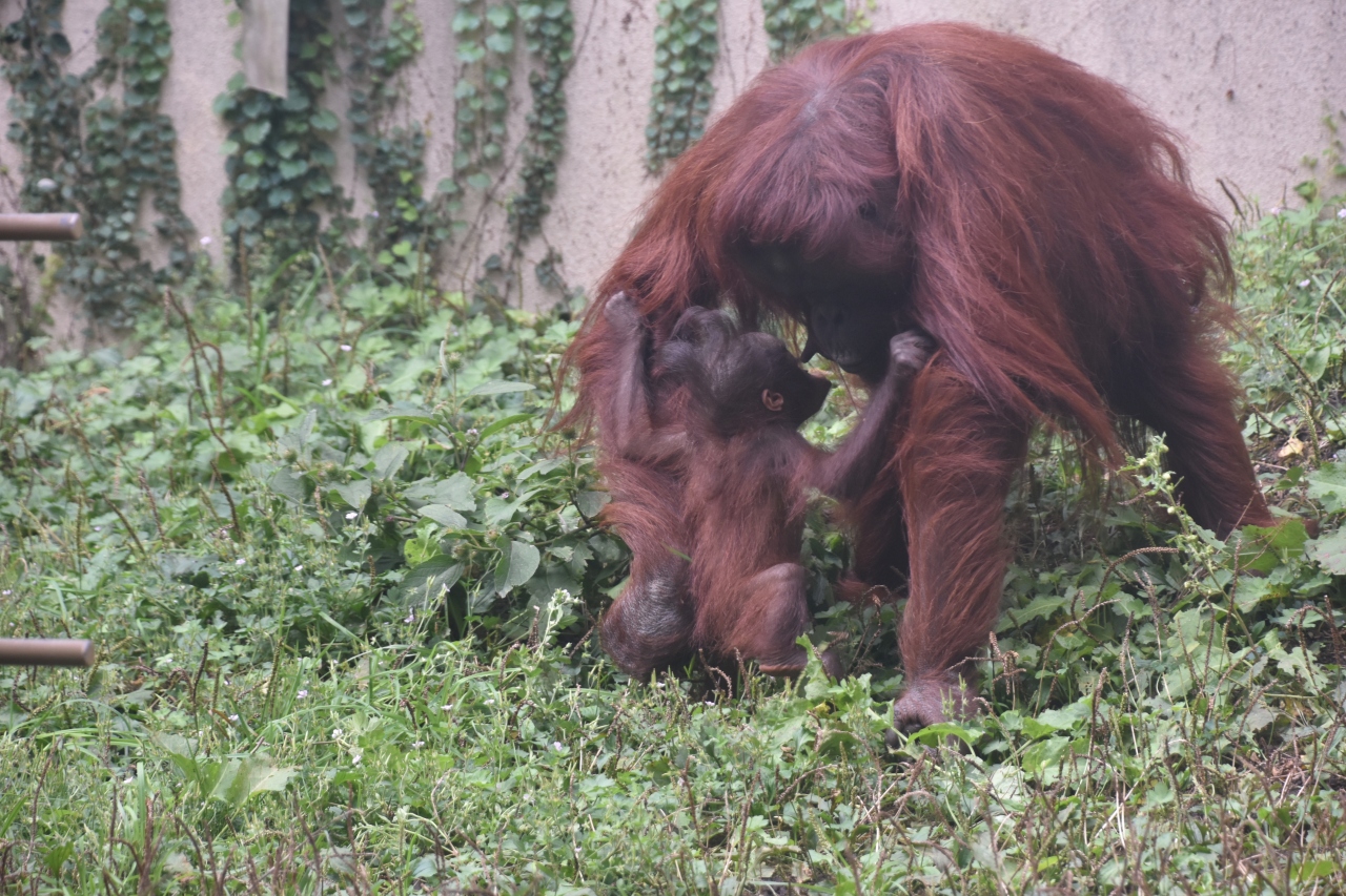 オランウータンの親子がいて,母親に甘える赤ちゃんオランウータンはとてもかわいいです.まるで人間の赤ちゃんのようです.