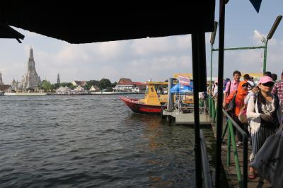 チャオプラヤーエクスプレスが行き交う間を縫うようにして進む渡し船はまたおもしろいです.また,ワットアルンの大仏塔がきれいに見えます.- 旅行時期