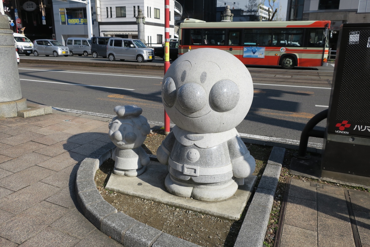 はりまや橋近くの道路脇にアンパンマンの石像があります.さすが,やなせたかしさん出身の高知だな,と思いました.