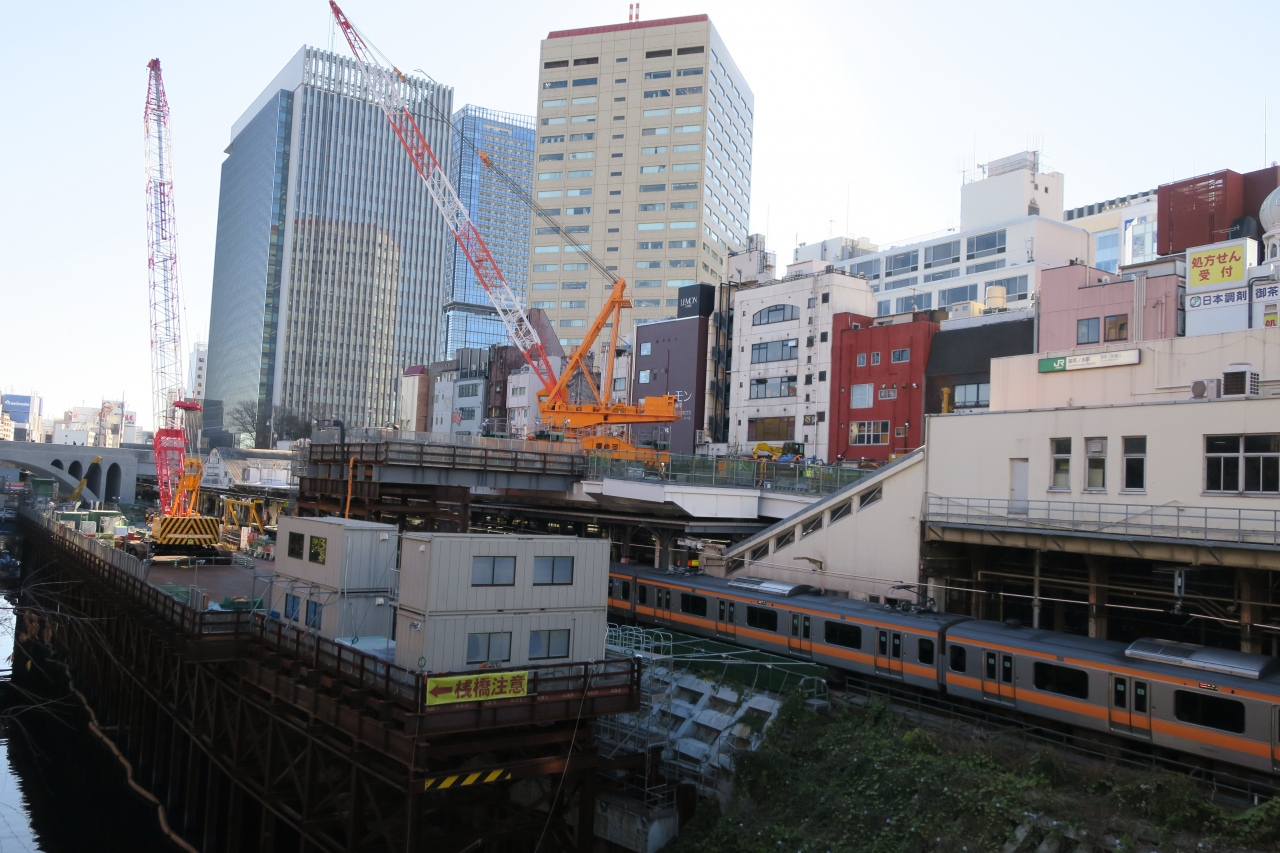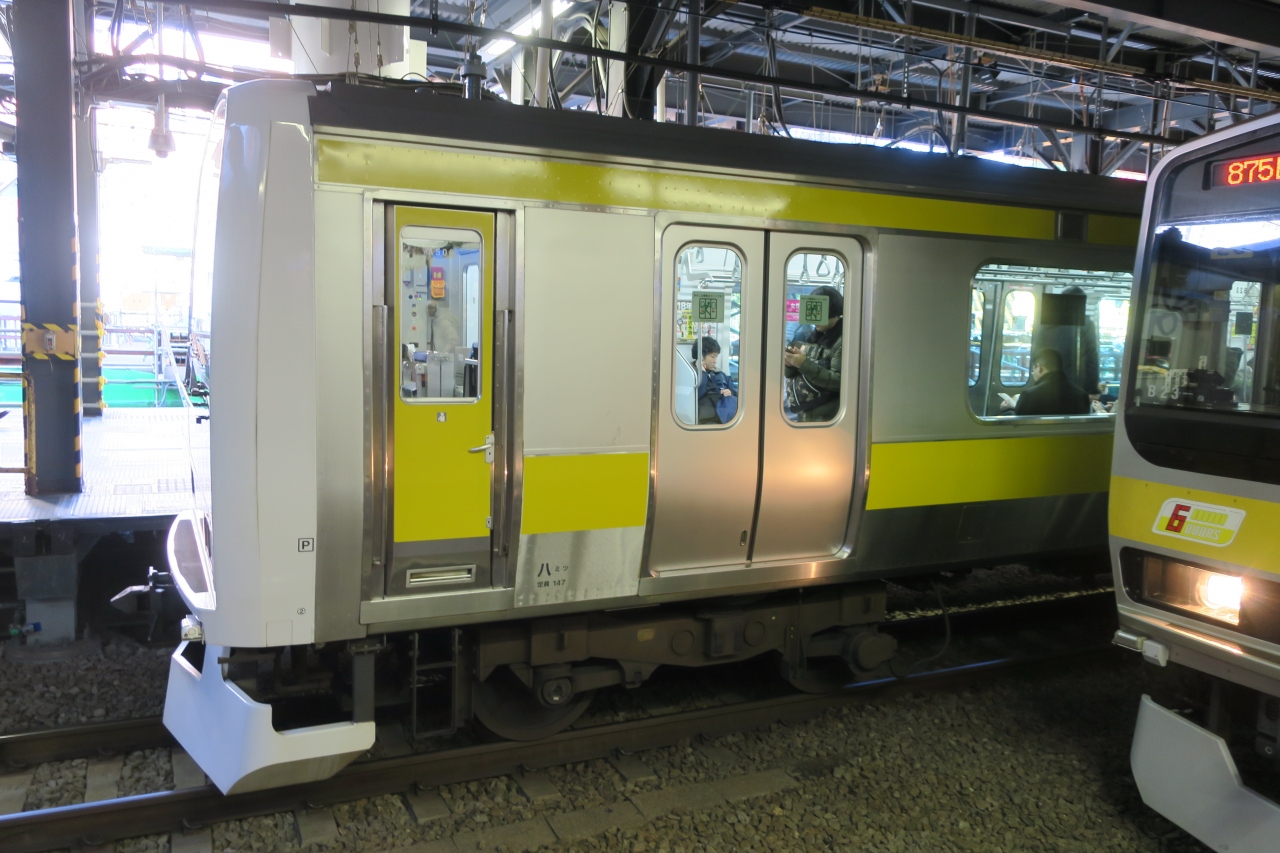 JR総武線は,東京―錦糸町―千葉…と走る「快速」と,中央線―御茶ノ水―錦糸町―千葉と走る「各停」の2系統があります.各停に乗ると,秋葉原付近でかなり高い所を走り,眺めがいいのがおもしろいです.ただし,いつでも混んでいます.