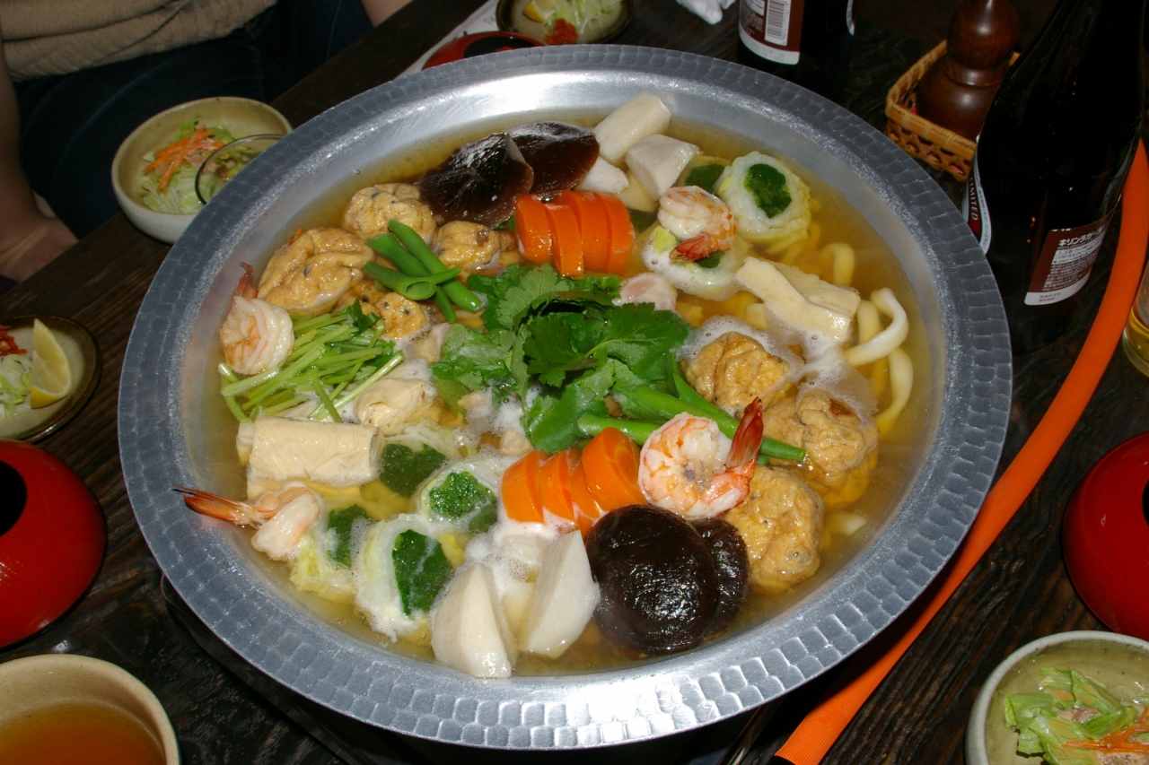 だしに太目のうどんそして・・・一品一品味のついたお野菜やお肉を