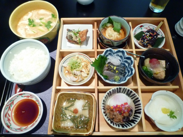 そして9つに区切られた木の箱に入って出てきたお豆腐やお魚料理は