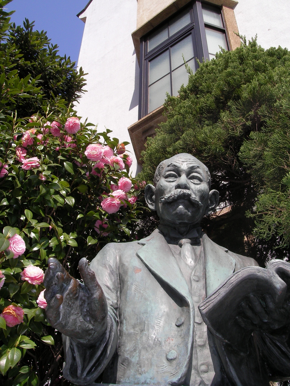 銅像と椿と建物のこの1枚はお気に入り。