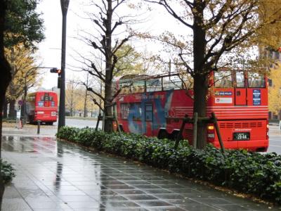 東京駅の丸の内側に、赤い大きなバスが停まっていました。