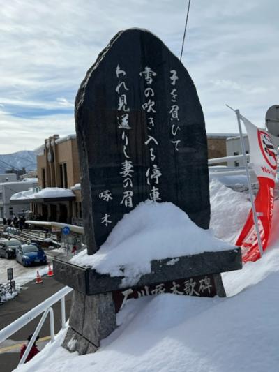 札幌1人旅で新千歳空港に着き直接小樽に行きました。JR小樽駅を出て左に進むと階段がありその上に三角市場があります。三角市場の前にある石川啄木の歌碑です。
