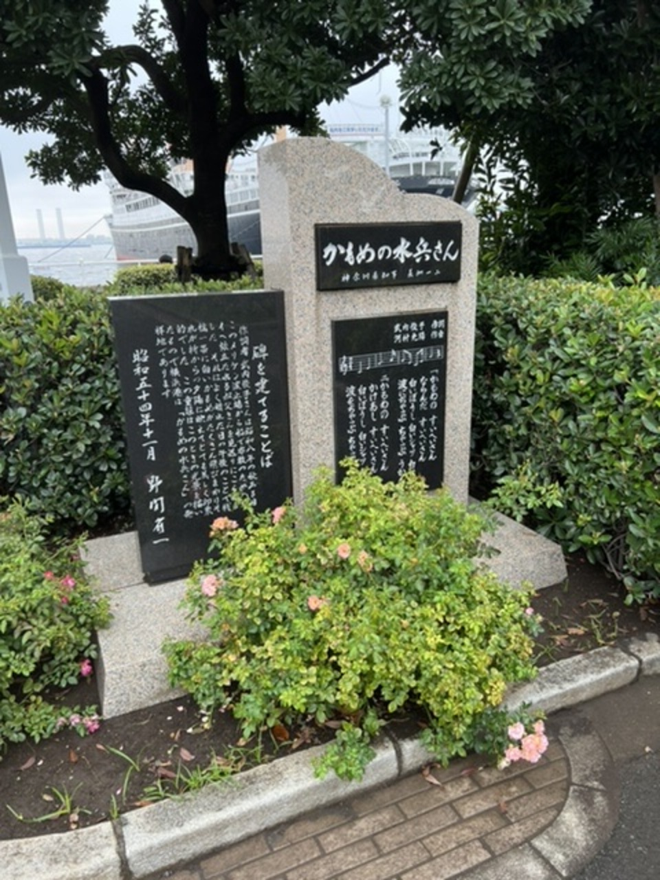 当初は館山市の伊戸にスキューバダイビングでシャークスクランブルを見に行く予定でしたが天候・海況が悪く暇になってしまったので横浜中華街に食べ飲みに行きました。午前から行き時間があったので山下公園に。氷川丸の前にある歌碑です。