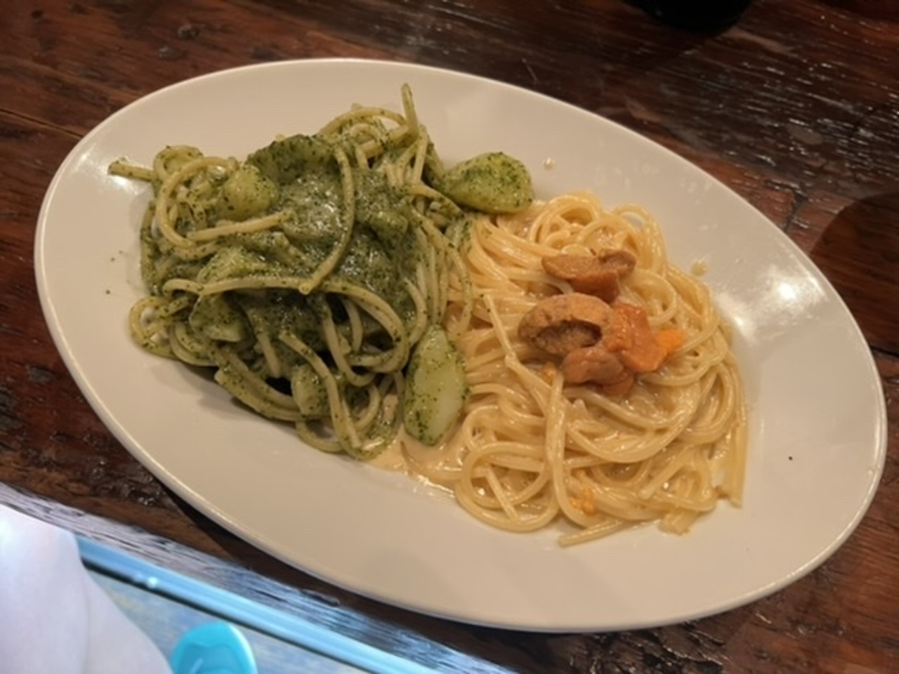 ジェノベーゼとウニクリームのダブルスパゲッティにしました。赤ワインボトルで。