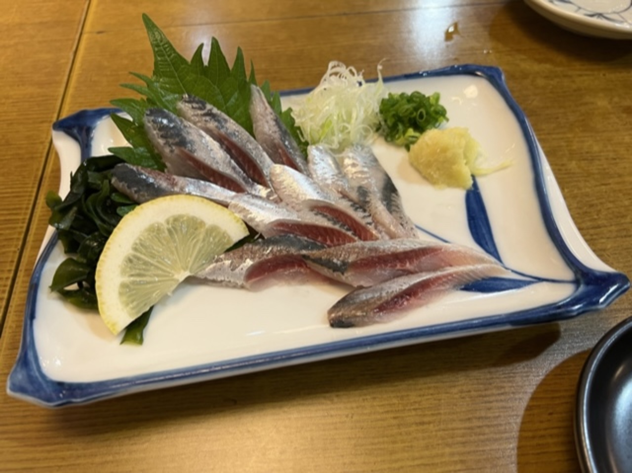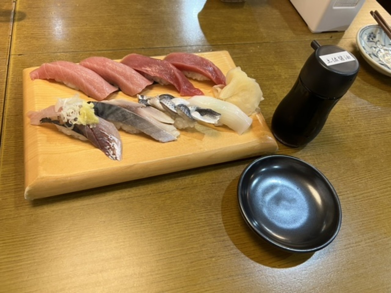 先ずは生ビール!そして寿司をお好みで、イカ、コハダ、シメサバ、アジに赤身と中トロを2貫ずつ。そして沢の鶴!真鰯の刺身は臭みも無くグッド!