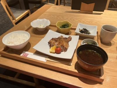 食べたのは本日のお薦め肉料理1,100円!鶏の柑橘照り焼きでした。おばんざい3種、漬物、ご飯、赤出汁が付きます。