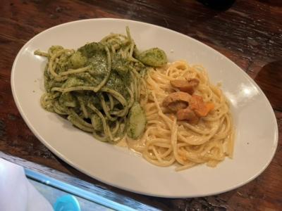 • ジェノベーゼとウニクリームのダブルスパゲッティを赤ワインで!