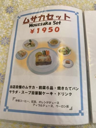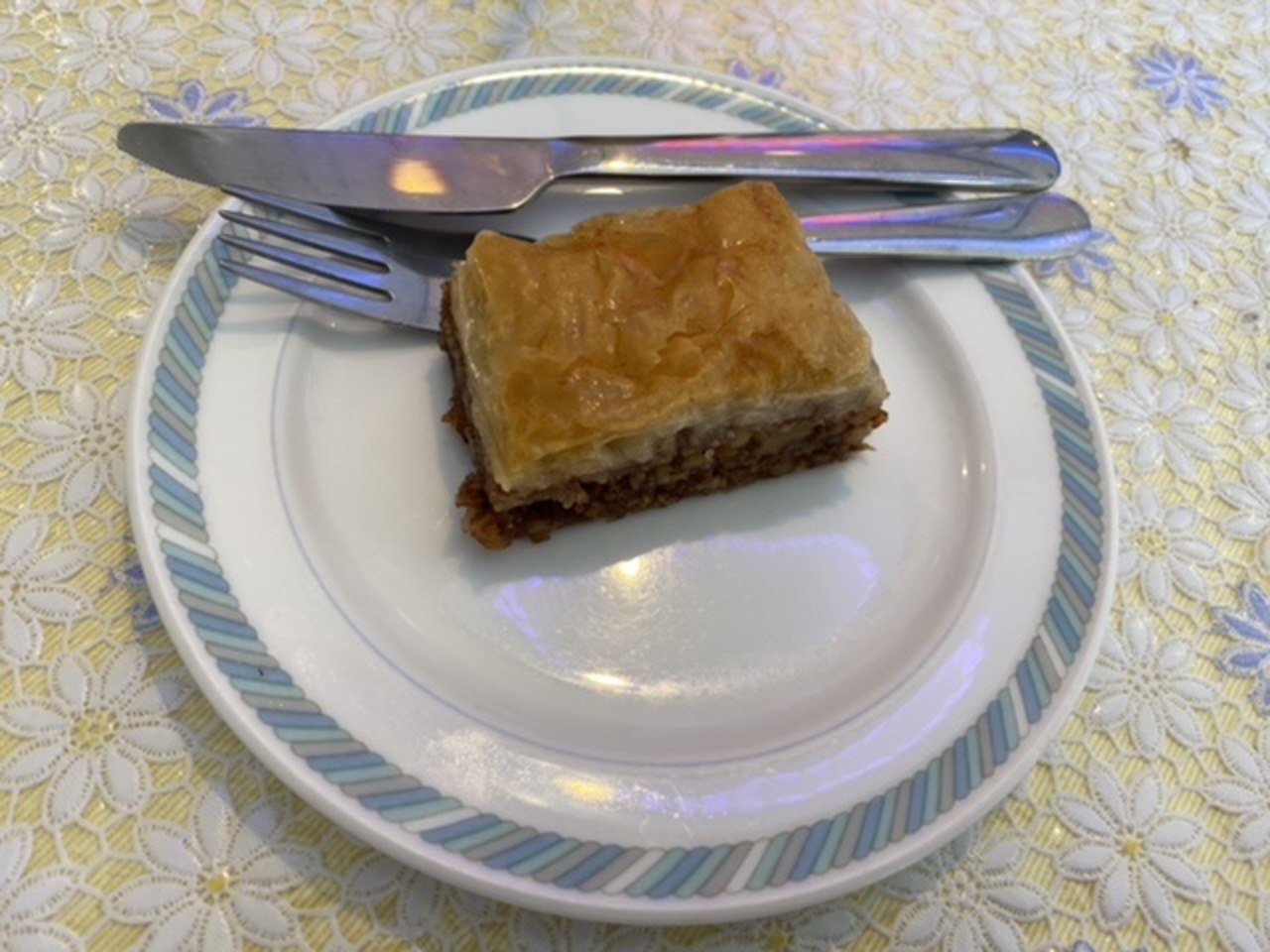 食べたのはムサカセット1,950円!先ずはサラダ。前菜盛合せ、ディップはパンに付けて食べます。スープは白インゲンの入ったミネストローネ風。そしてムサカ!ここのムサカは美味い!ワインが無いのが淋しいね。デザートはバクラバにアイスコーヒーを。甘~い!- 旅行時期