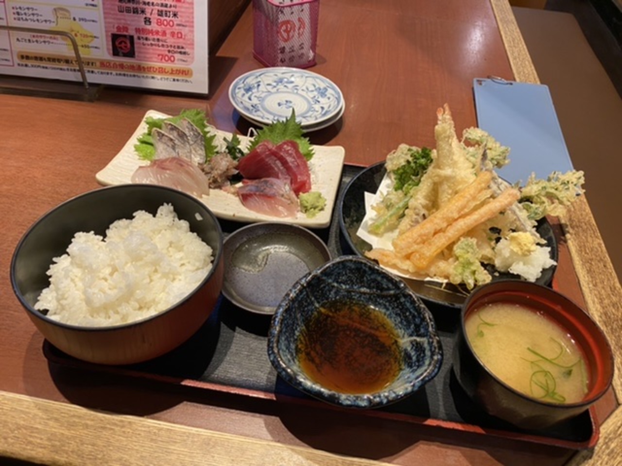 食べたのは天ぷら・刺身定食1,200円!大好きな刺身と天ぷらの組み合わせでボリュームもあります。美味しいですね(^^)- 旅行時期