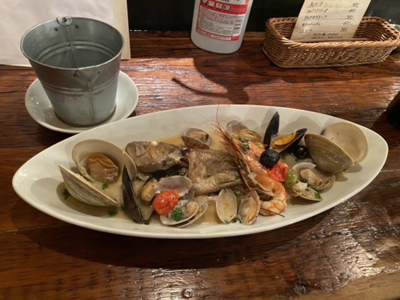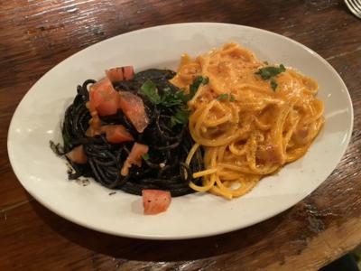 先ずはシチリア赤ワインのトリチェッロをボトルで!レバームース、1尾まるごとのアクアパッツァ、イカ墨とトマトカルボナーラのダブルスパゲッティ。ここの料理は美味しいですね(^^)- 旅行時期