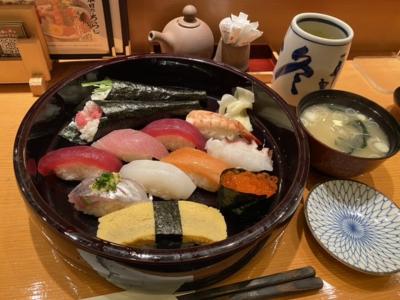 にぎり寿司10貫に手巻き寿司が2つ、味噌汁か小うどんが選べます。男性には丁度良いボリュームですね。- 旅行時期