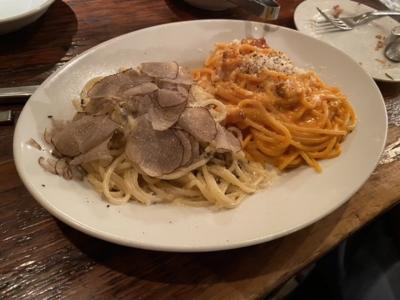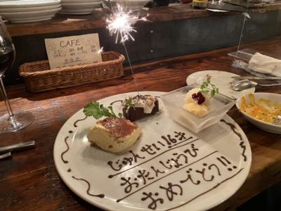 ローストチキンにトマトカルボナーラとトリュフクリームソースのダブルスパゲッティをスパークリングワインと赤ワインでいただきました。最後はバースデープレートで!- 旅行時期