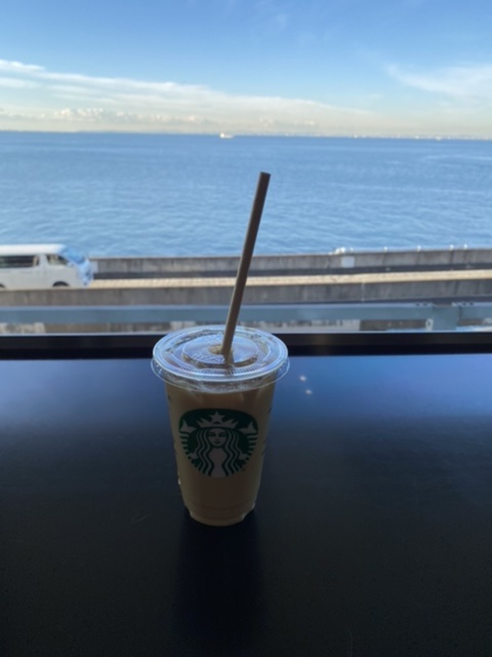 かずさで蕎麦を食べた後にちょっと休憩でアイススターバックスラテを海を眺めながら飲みましたよ。- 旅行時期