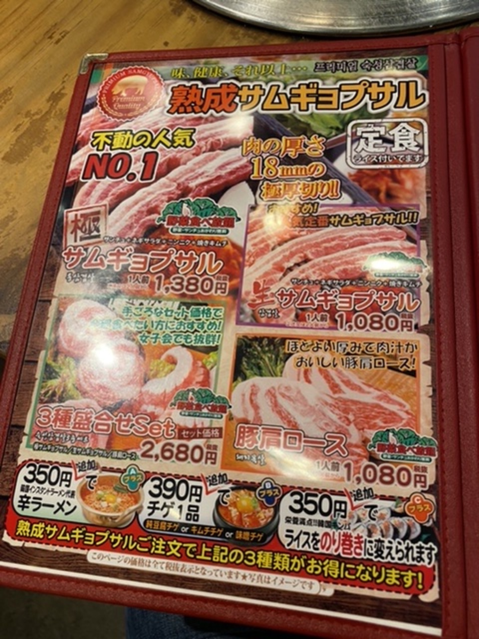 サムギョプサルを食べようと鐘路本家に行きましたが無くなっていて別のお店になっていました。それでカントンの思い出に入りました。サムギョプサルは2人前から、鐘路本家は1人前からたのめて良かったのですが、、、熟成サムギョプサルの極サムギョプサルとサムギョプサルを1人前ずつ。