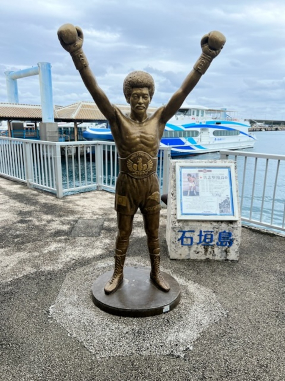 西表島1人旅で立ち寄りました。ユーグレナ石垣港離島ターミナルにある金ピカの像です。元WBA世界ライトフライ級王者の像です。13回も世界防衛した石垣島のスターボクサーです。ニックネームはカンムリワシ!ちょっちゅね!
