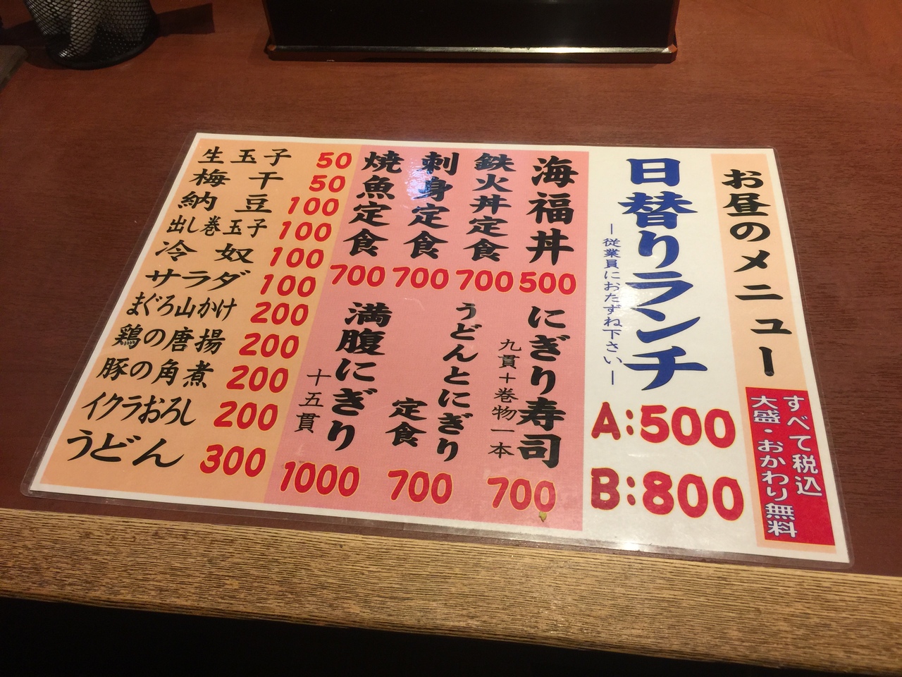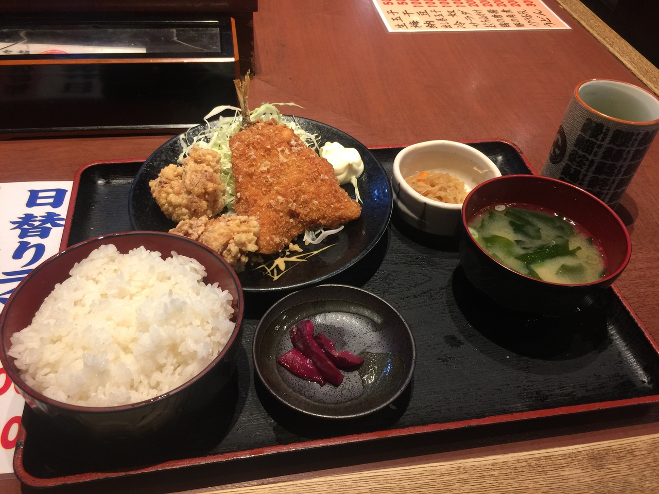 食べたのは日替りランチA!ワンコインの税込500円です。この日はアジフライと鶏唐揚げでした。切り干し大根と漬物にご飯と味噌汁です。この金額でご飯はおかわり自由!リーズナブルです(^ ^)- 旅行時期