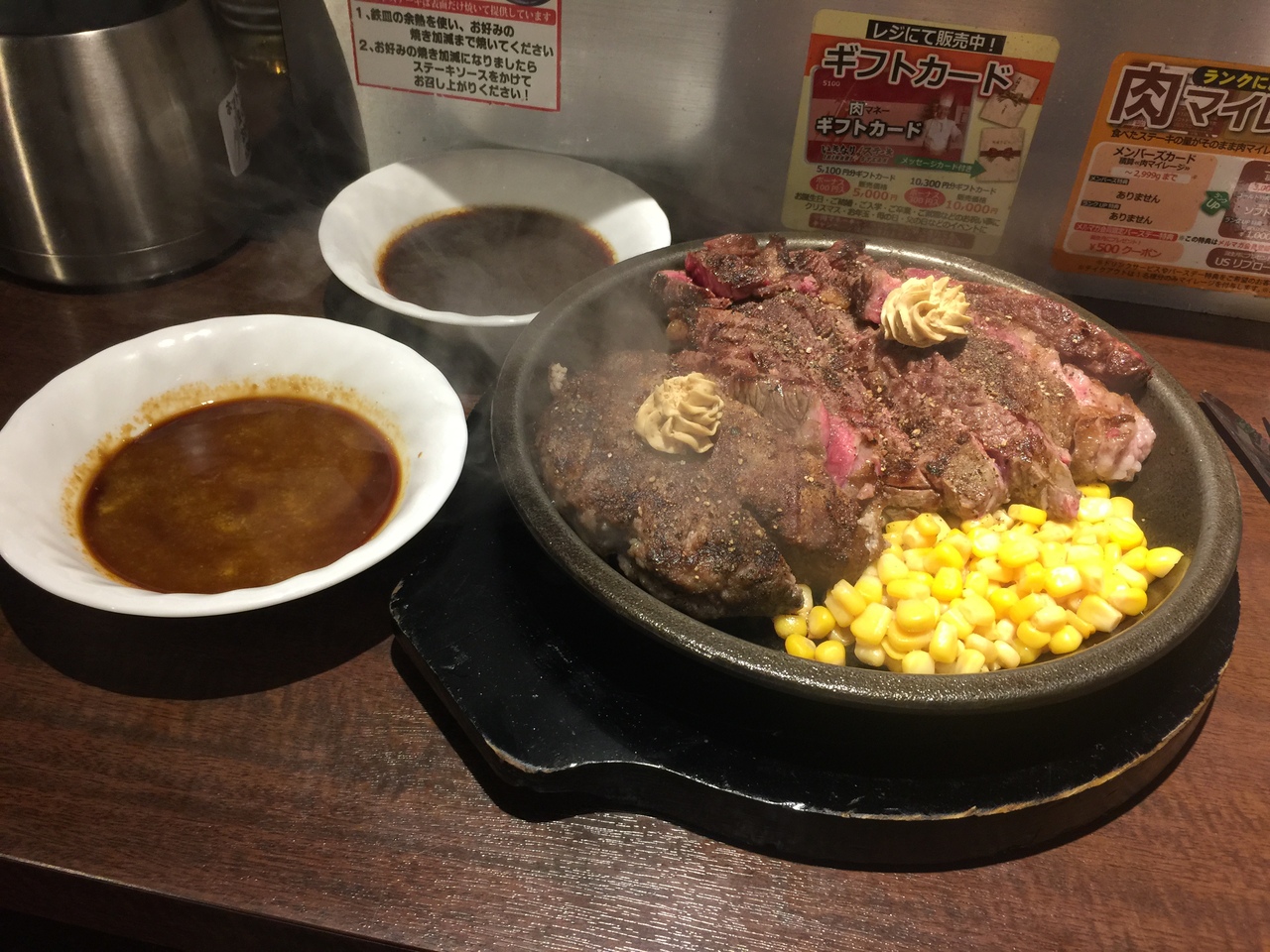 食べたのはワイルドステーキ450gにハーフバーグ150gの肉600g!生ビールは肉マイレージプラチナカードでサービス(^ ^)