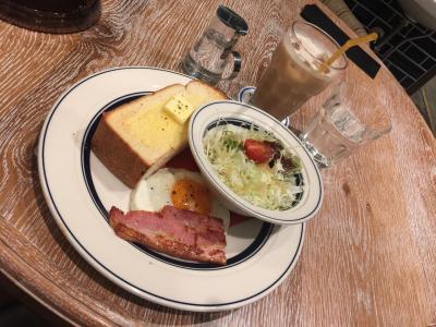 食べたのはトーストセットのAセット500円税別!厚切りトーストに厚切りベーコン、サラダ、目玉焼きにドリンクです。なかなかイイ内容ですね(^ ^)- 旅行時期