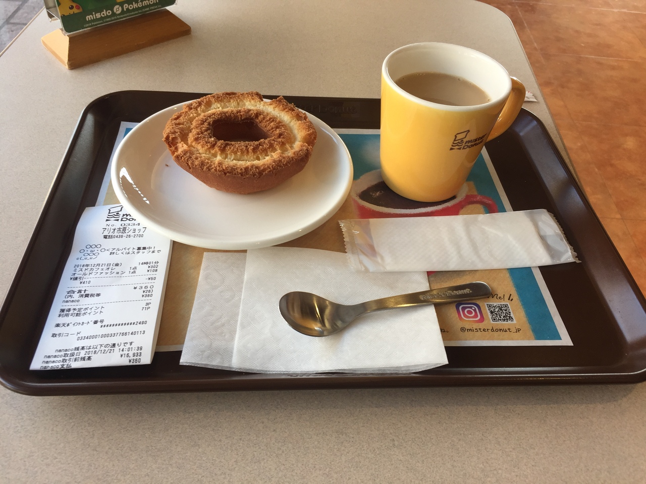 食べたのはオールドファッションにカフェオレ!楽天ポイントカードを提示したら50円引きになりました(^ ^)- 旅行時期
