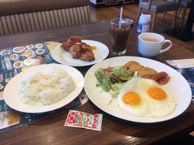 食べたのは目玉焼きセットに鶏唐揚げを付けて、、、ライスは大盛!