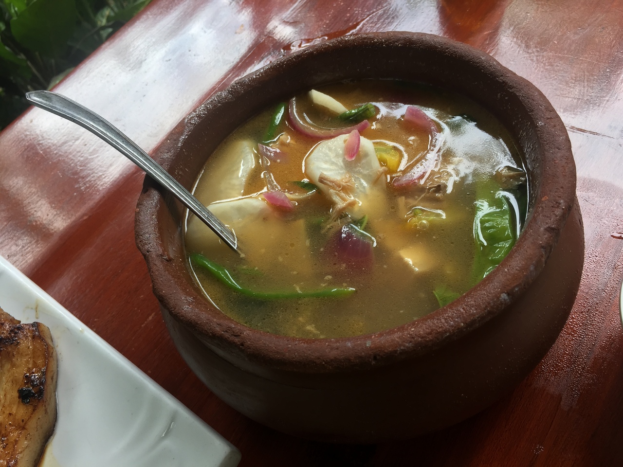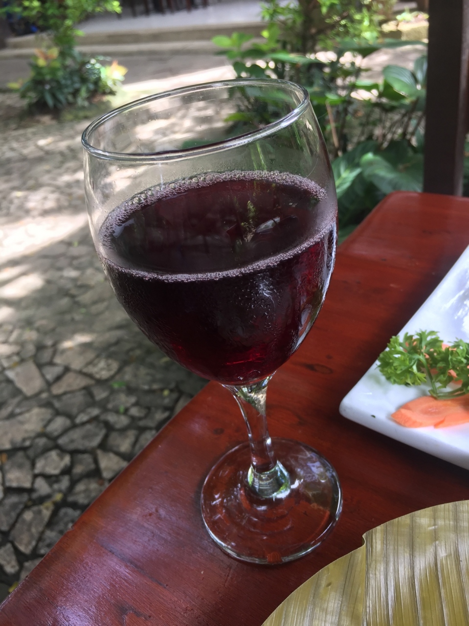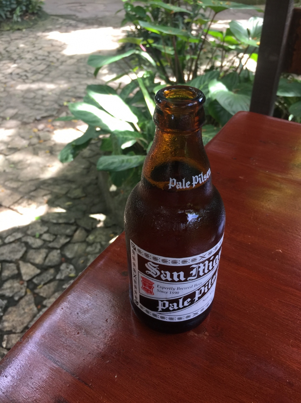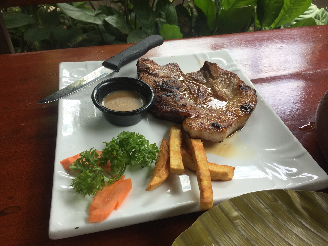 豚のシニガンとポークステーキの豚づくしにサンミゲル、赤ワイン!