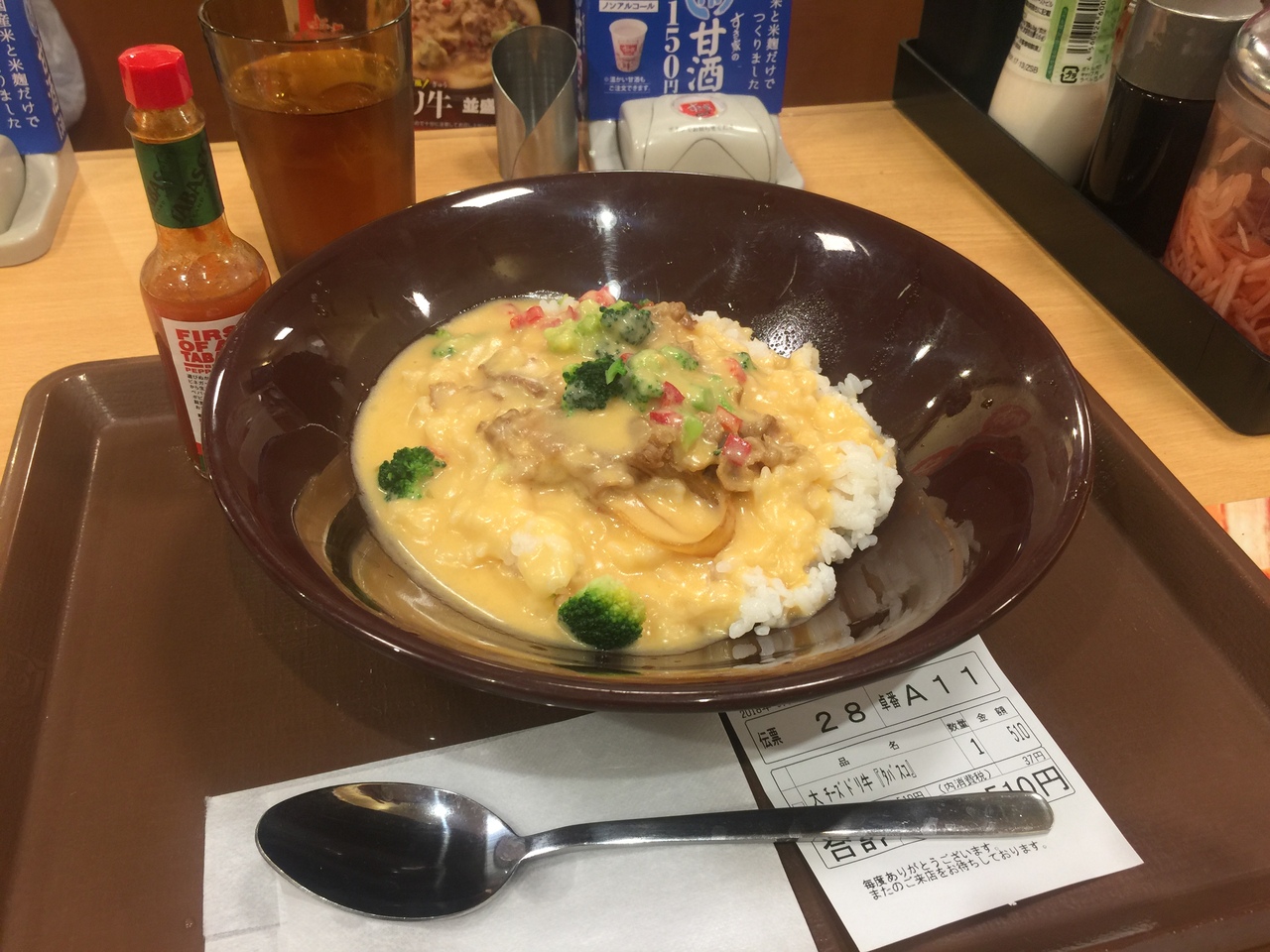 牛丼にするか!?ポークカレーにするか!?まよいましたが4種のチーズドリ牛ごはん大盛510円にしました。