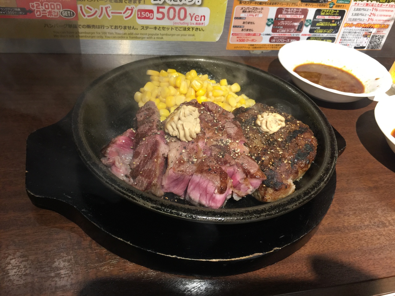 300店舗出店キャンペーンでワイルドステーキ300gが1,000円だったので行きました。ワイルドステーキ300gにハーフバーグを付けて税別1,500円!プラチナカードで生ビールはサービス!
