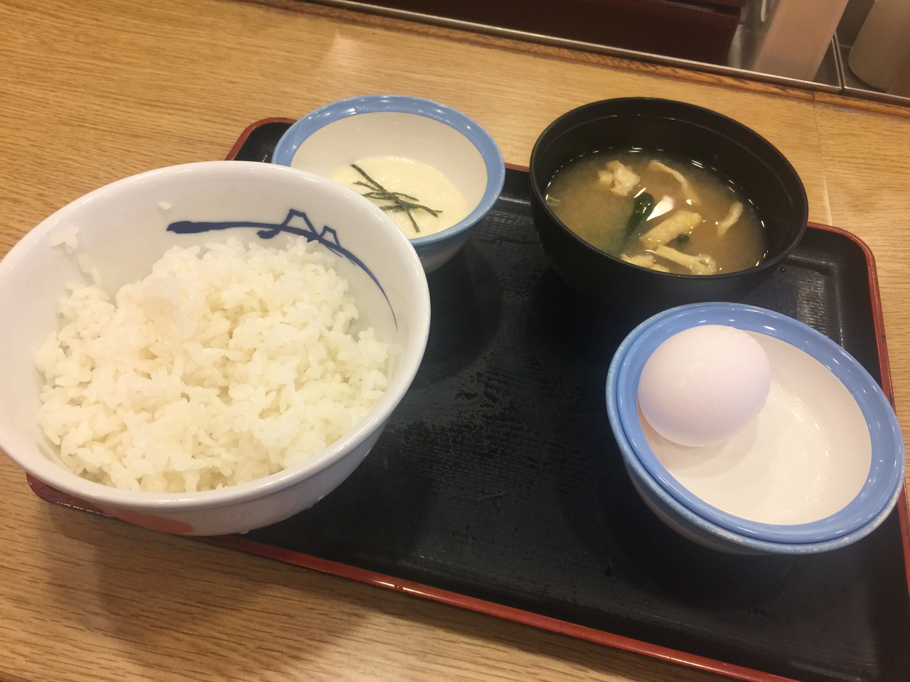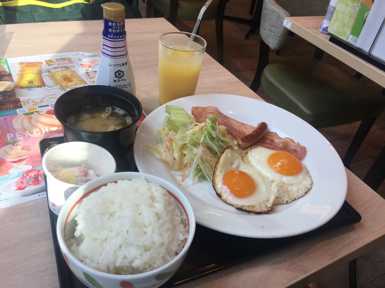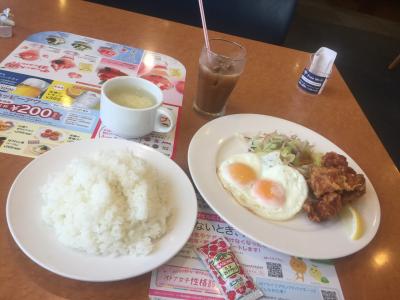 食べたのは目玉焼きセットに鶏唐揚げを付けてご飯大盛!朝からガッツリでした(^ ^)- 旅行時期