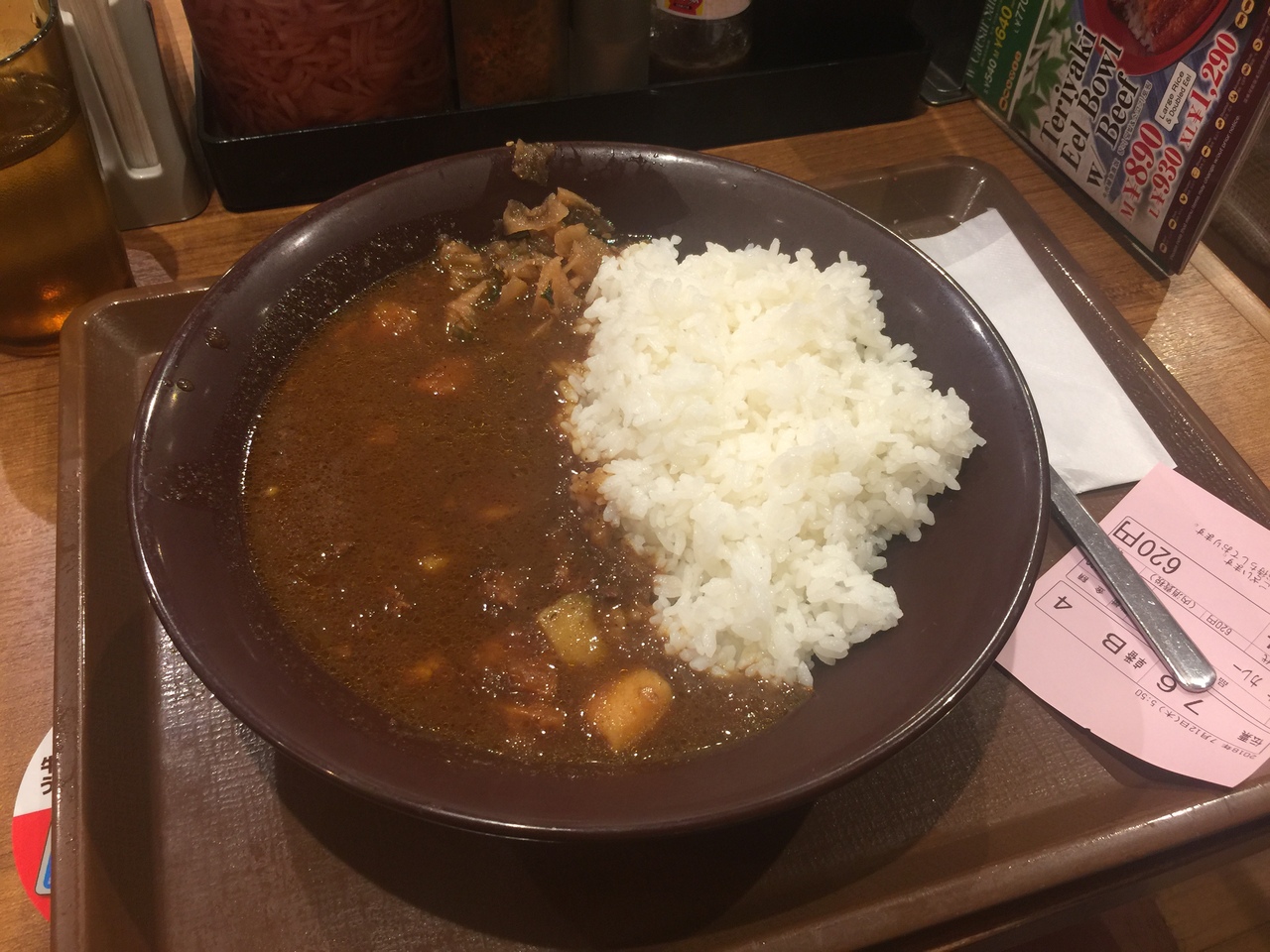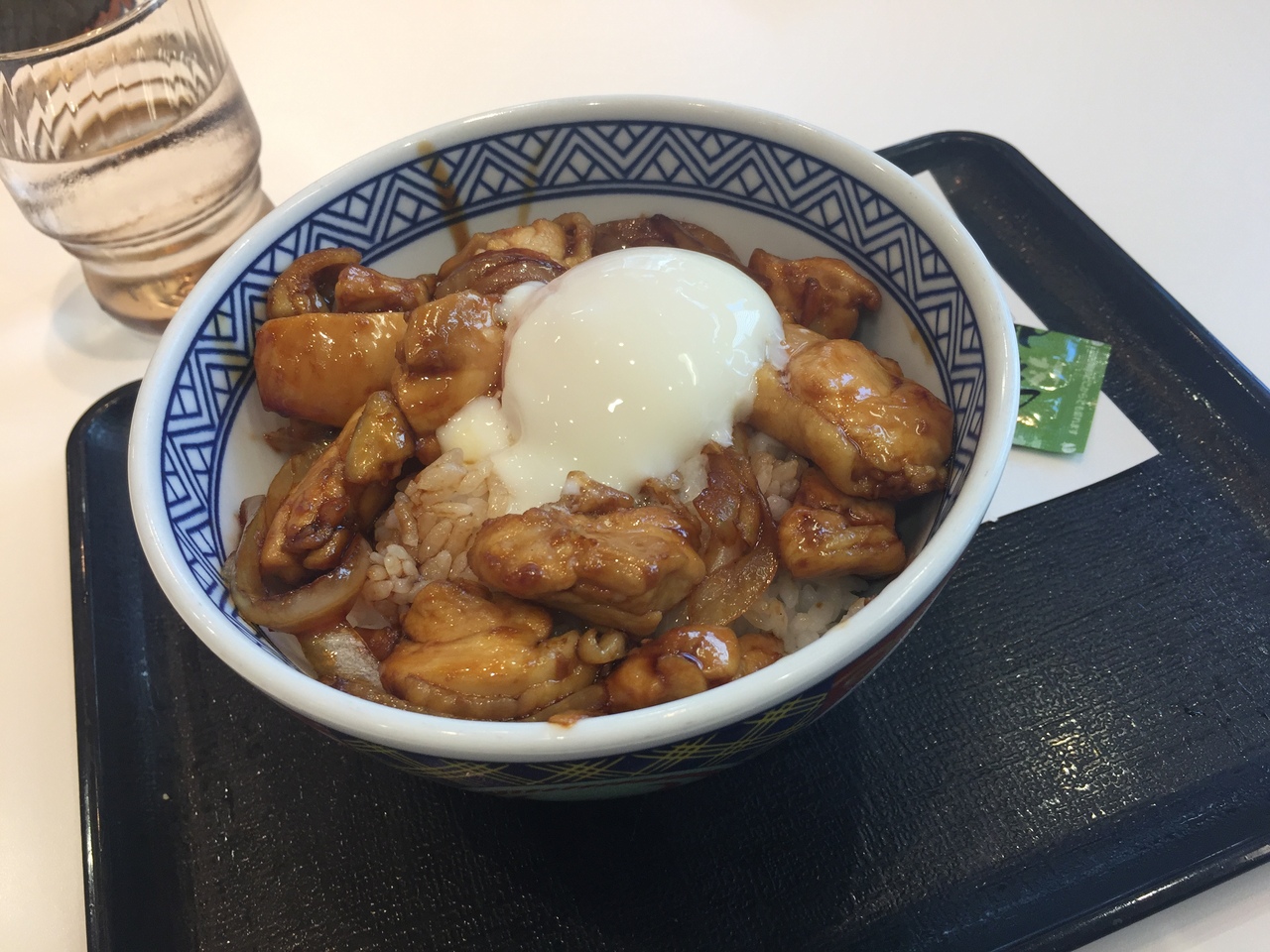 いつもは牛丼を食べることが多いんですが、、、この日は鶏すき丼450円!鶏肉のすき焼き風に温泉卵がのっています。美味しいですね(^ ^)