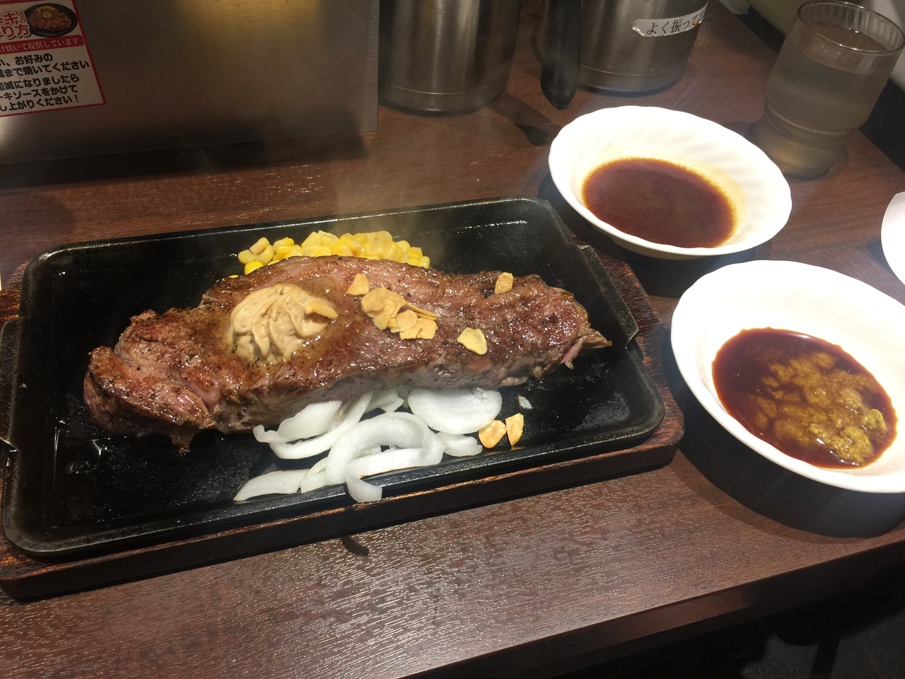 本格熟成国産牛サーロインステーキ300gにしました。生ビールはプラチナカードでサービスのタダです。
