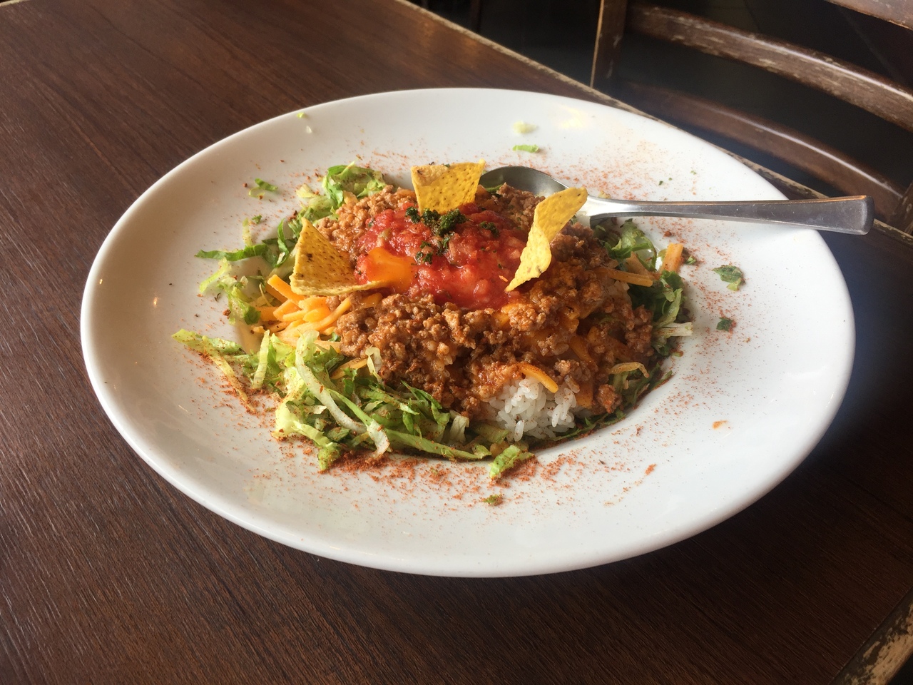 食べたのはフライデーズタコライス850円!100円プラスで大盛にしました。なかなか美味しいです(^ ^)