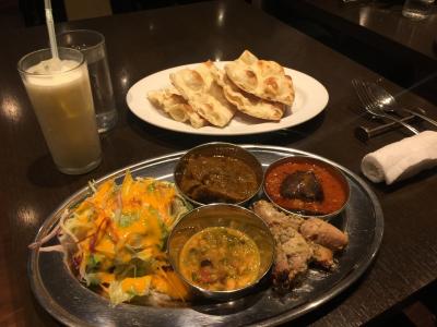 カレー3種類にサラダ、チキン、、、ナン、ライス!この日は茄子のカレーが美味しかったです。