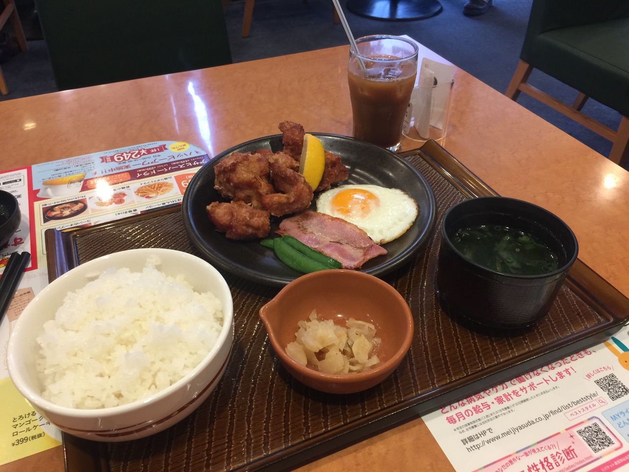 目玉焼き&ベーコン朝定食に鶏唐揚げ!