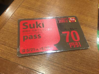 すきパスという一定期間何度でも牛丼類とカレー類が70円引きになるパスカードがあるのを発見!200円だったら3回利用すれば元が取れる(^ ^)
