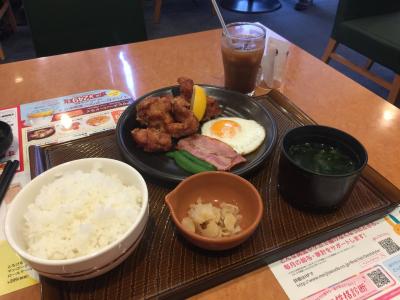 食べたのは目玉焼き&ベーコン朝定食399円に鶏唐揚げ!あれっ、、、目玉焼きモーニングに鶏唐揚げ頼んだんだが、、、値段は一緒だが味噌汁が付くからスープバーは付かない、、、スープバーいただいてるし、、、店員さんに言ったら飲んでいいと。- 旅行時期