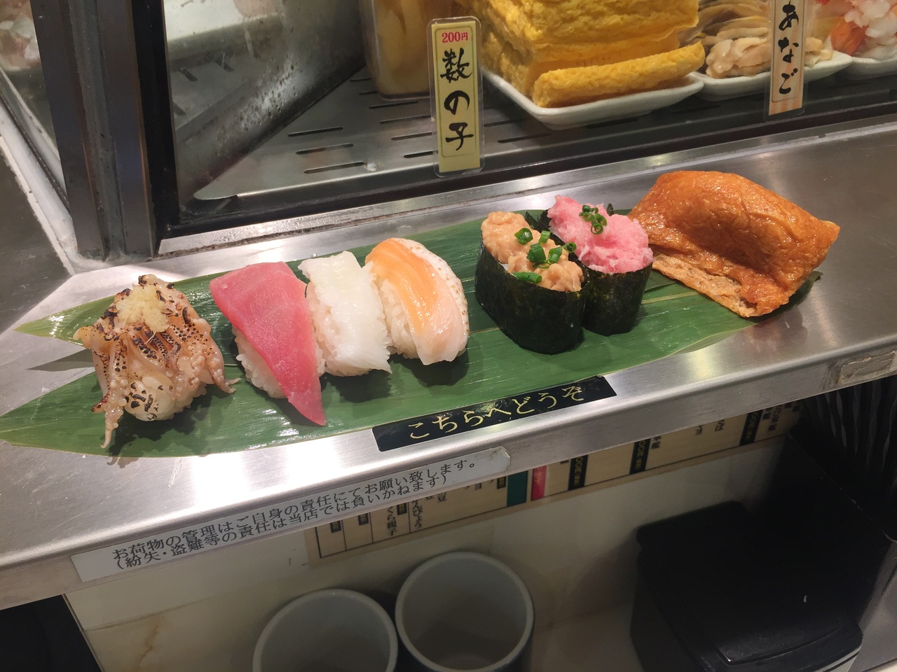 朝の7貫セット655円税別はマグロ、エンガワ、とろサーモン、焼きげそ、ネギトロ軍艦、納豆軍艦、いなり寿司!