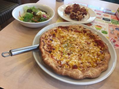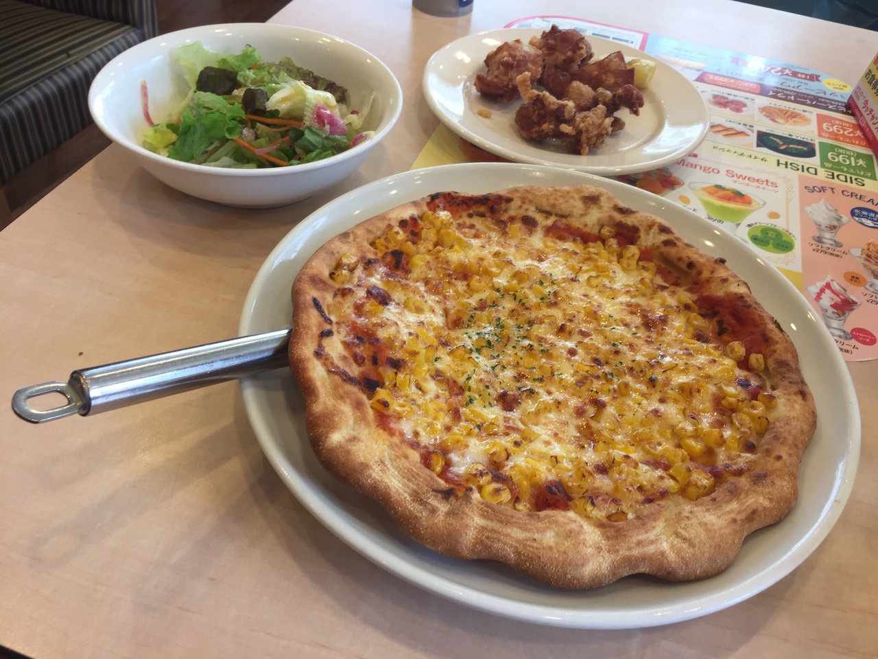 先ずは生ビール、そしてマヨコーンピザ、鶏唐揚げ、サラダ!